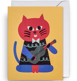 Mini card with illustration of a red cat in a jumper playing a guitar.
