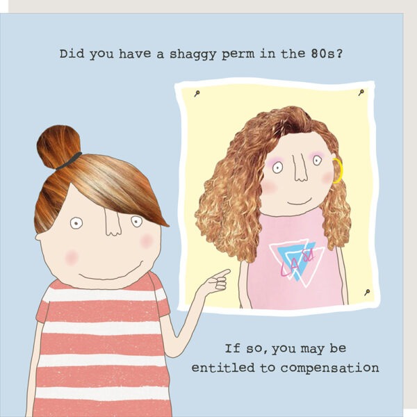 This card is for anyone who survived the horror of the 80’s shaggy perm and lived to tell the tale. Caption reads ‘Did you have a shaggy perm in the 80’s? If so, you may be entitled to compensation’.